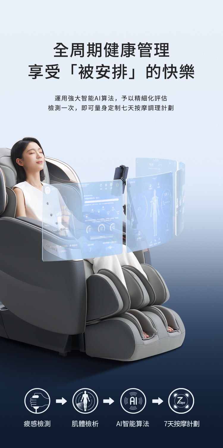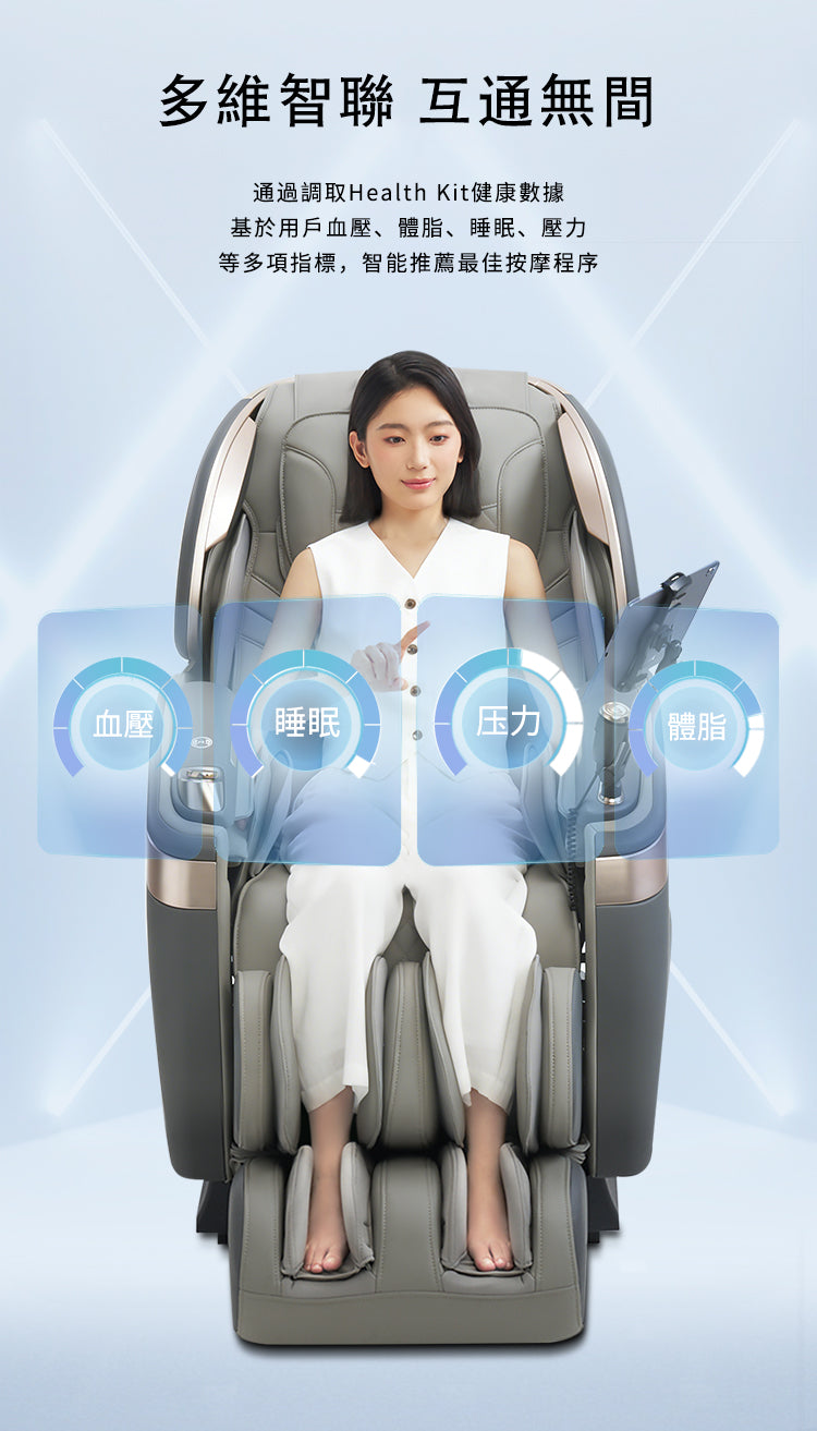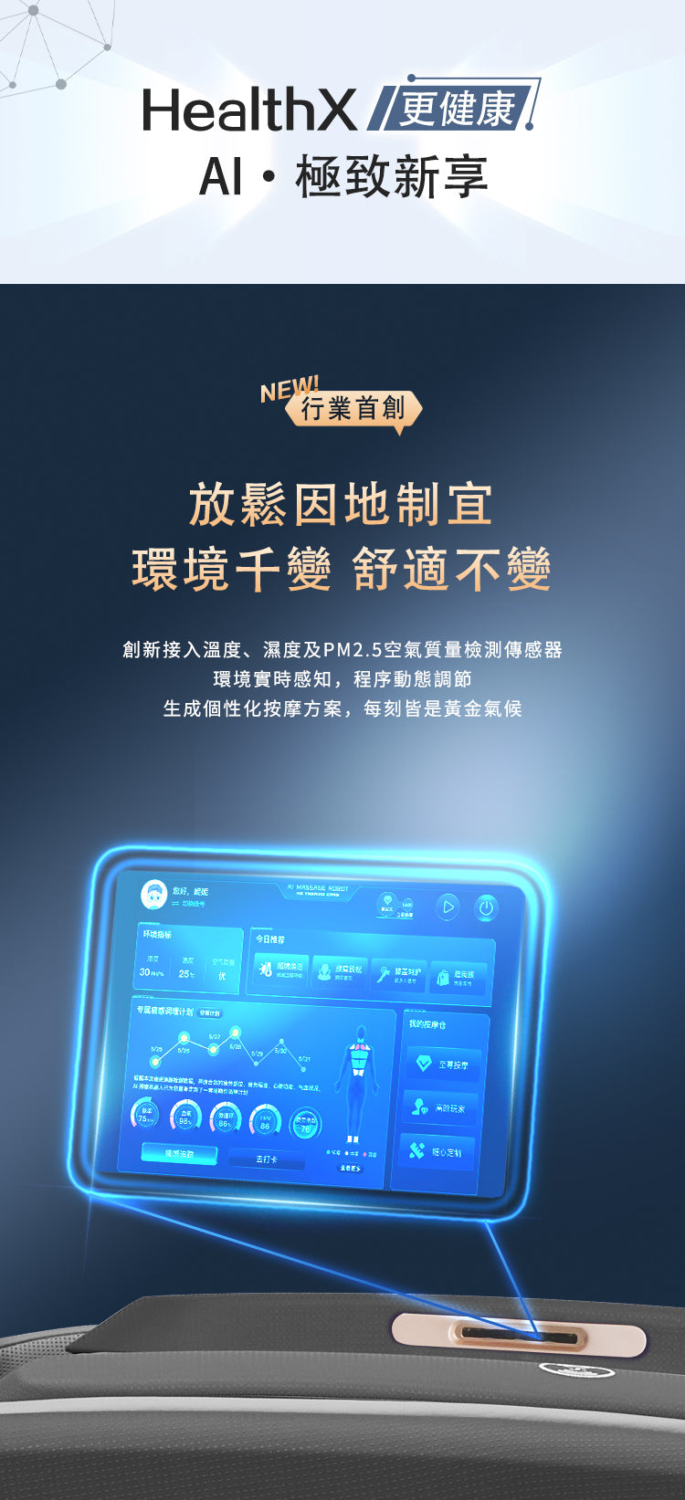 4D變頻調揉溫感機芯、靈動導軌、疲感追蹤分析、語音指令、溫濕度健康檢測