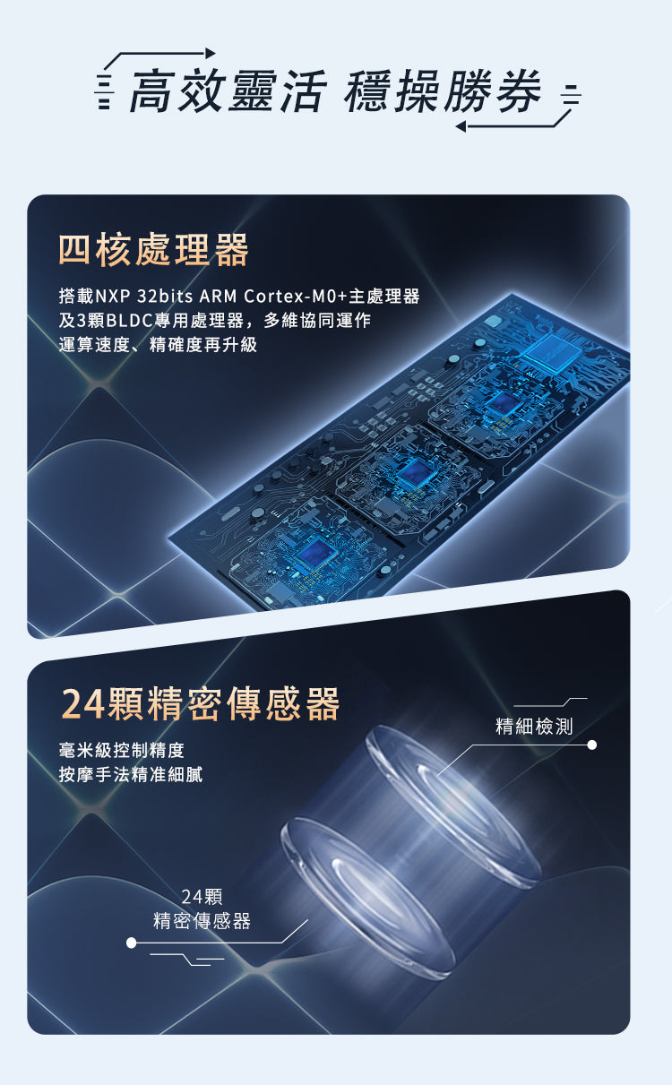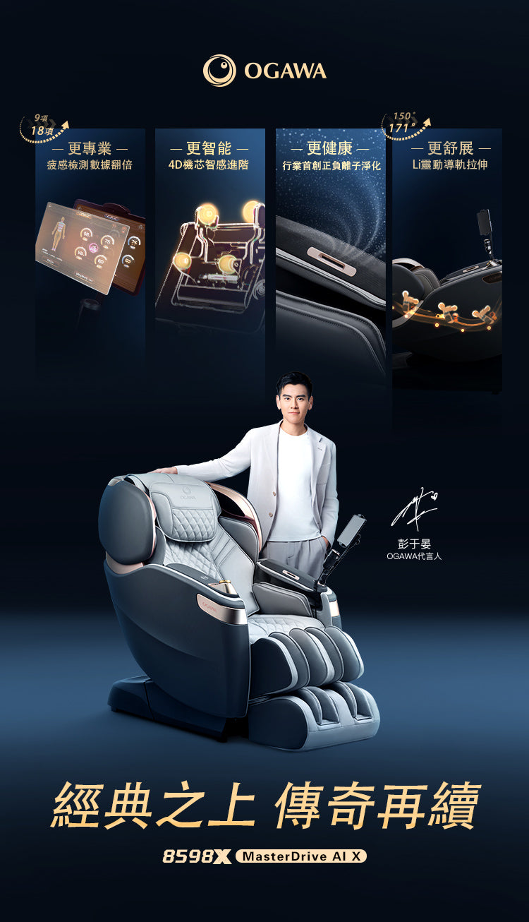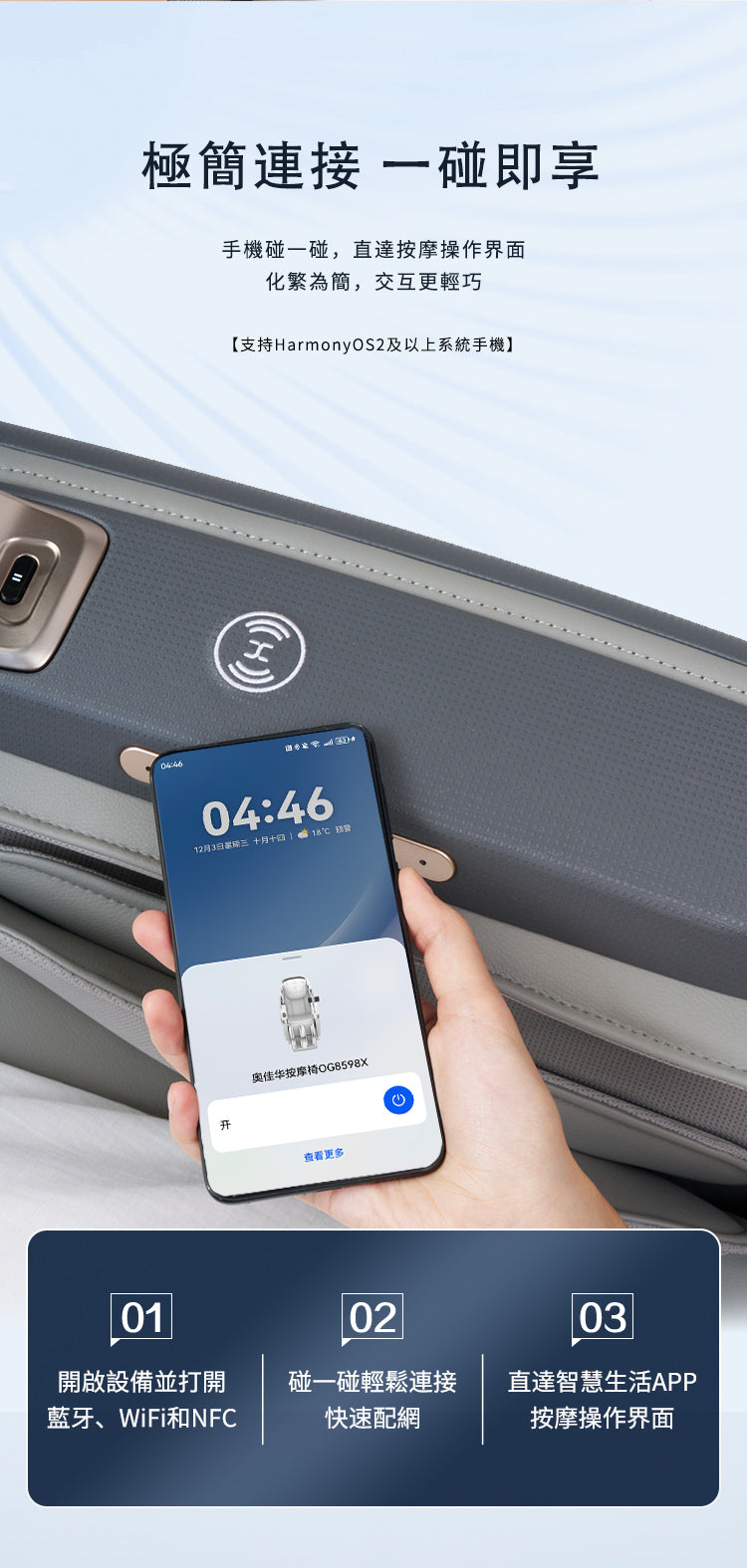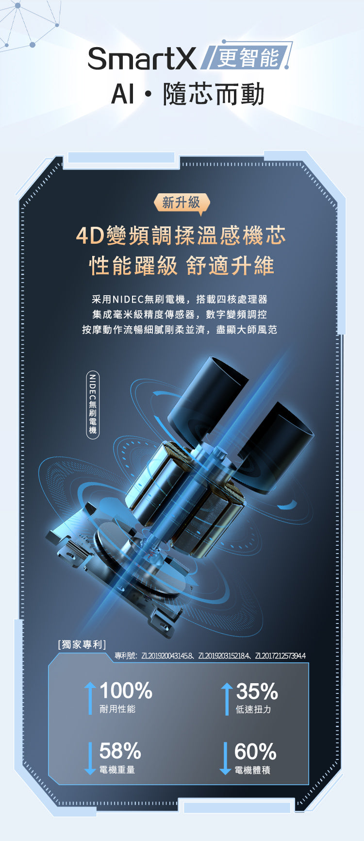 4D變頻調揉溫感機芯、靈動導軌、疲感追蹤分析、語音指令、溫濕度健康檢測
